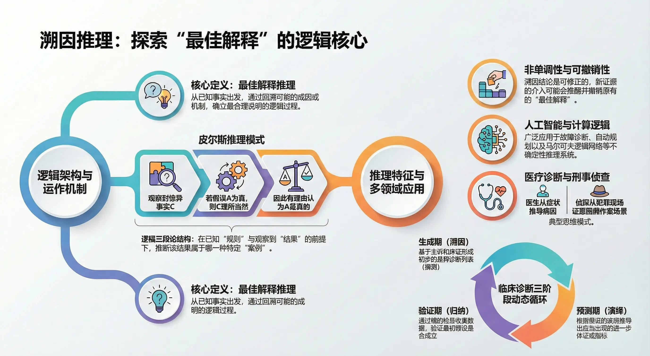 - 迭代(Iteration): 溯因结论具有“可撤销性(Defeasibility)”。随着新证据的获取,必须不断修正或放弃原有的“最佳解释”。