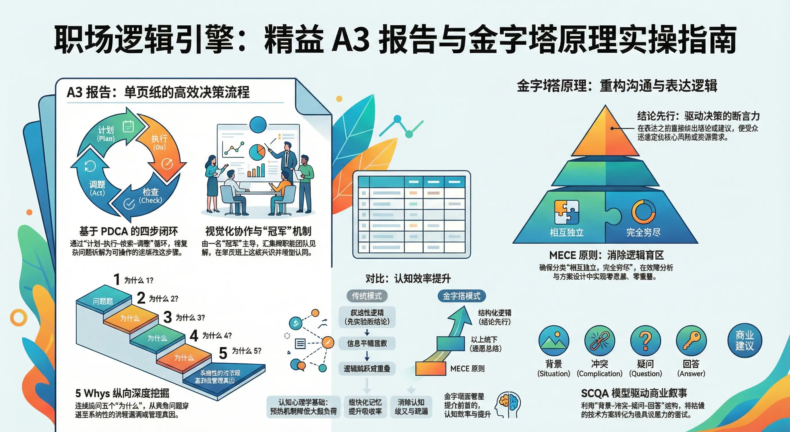 - 工具层:完成管理咨询模型(SCQA、A3、8D、5 Whys)与工程实践的双向映射,例如将SCQA重构为技术提案的商业叙事协议,把A3报告解构为“单页金字塔”的极致逻辑压缩;