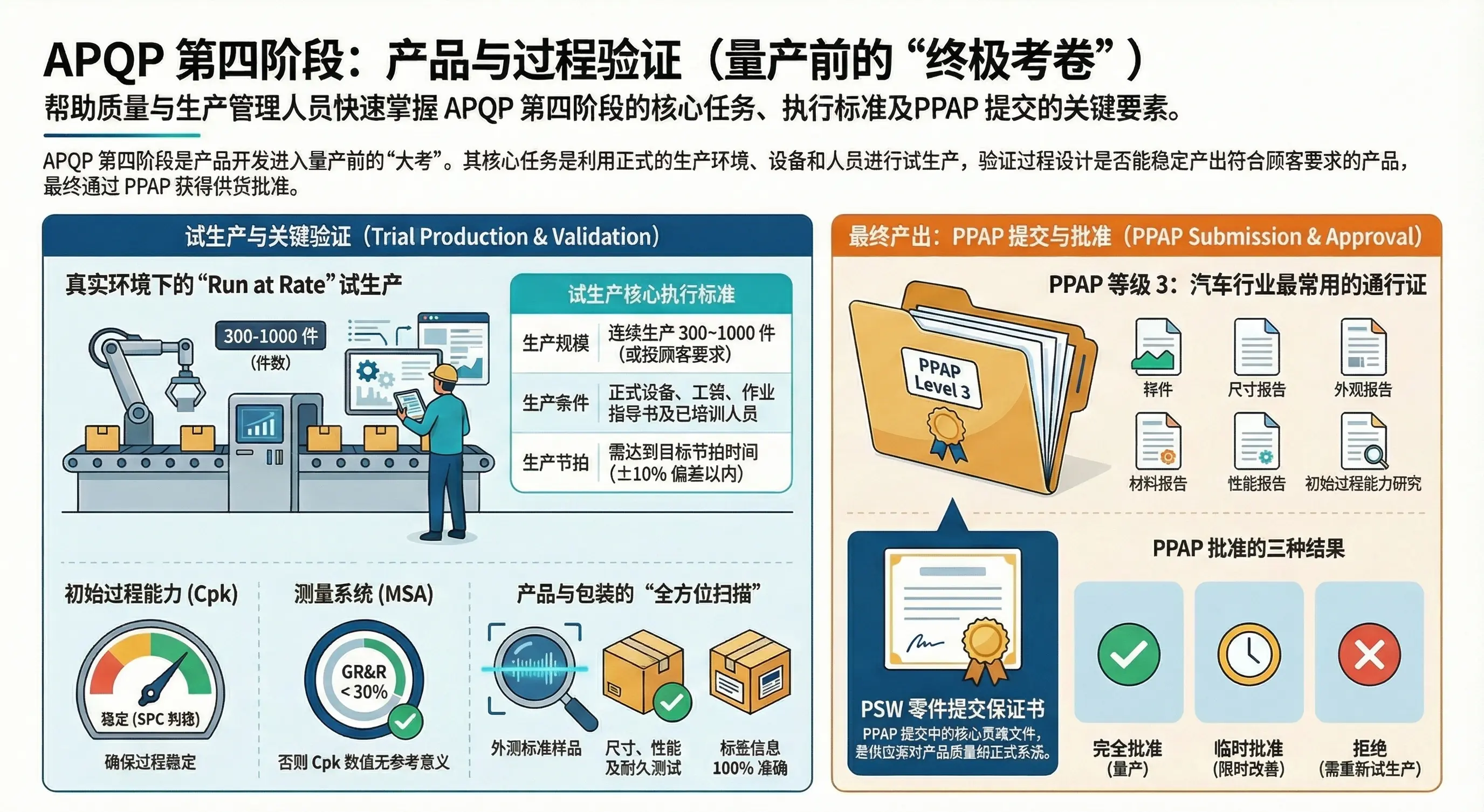 APQP(Advanced Product Quality Planning,先期产品质量策划)第四阶段——产品与过程验证,是整个APQP流程的“临门一脚”与关键验证关口。该阶段并非独立活动,而是前三阶段(计划与定义、产品设计开发、过程设计开发)成果在真实量产条件下的系统性压力测试与闭环验证。其本质是以试生产(Run at Rate)为载体,通过在正式设备、工装、人员、节拍和作业指导书条件下连续制造代表性数量的产品,全面检验: