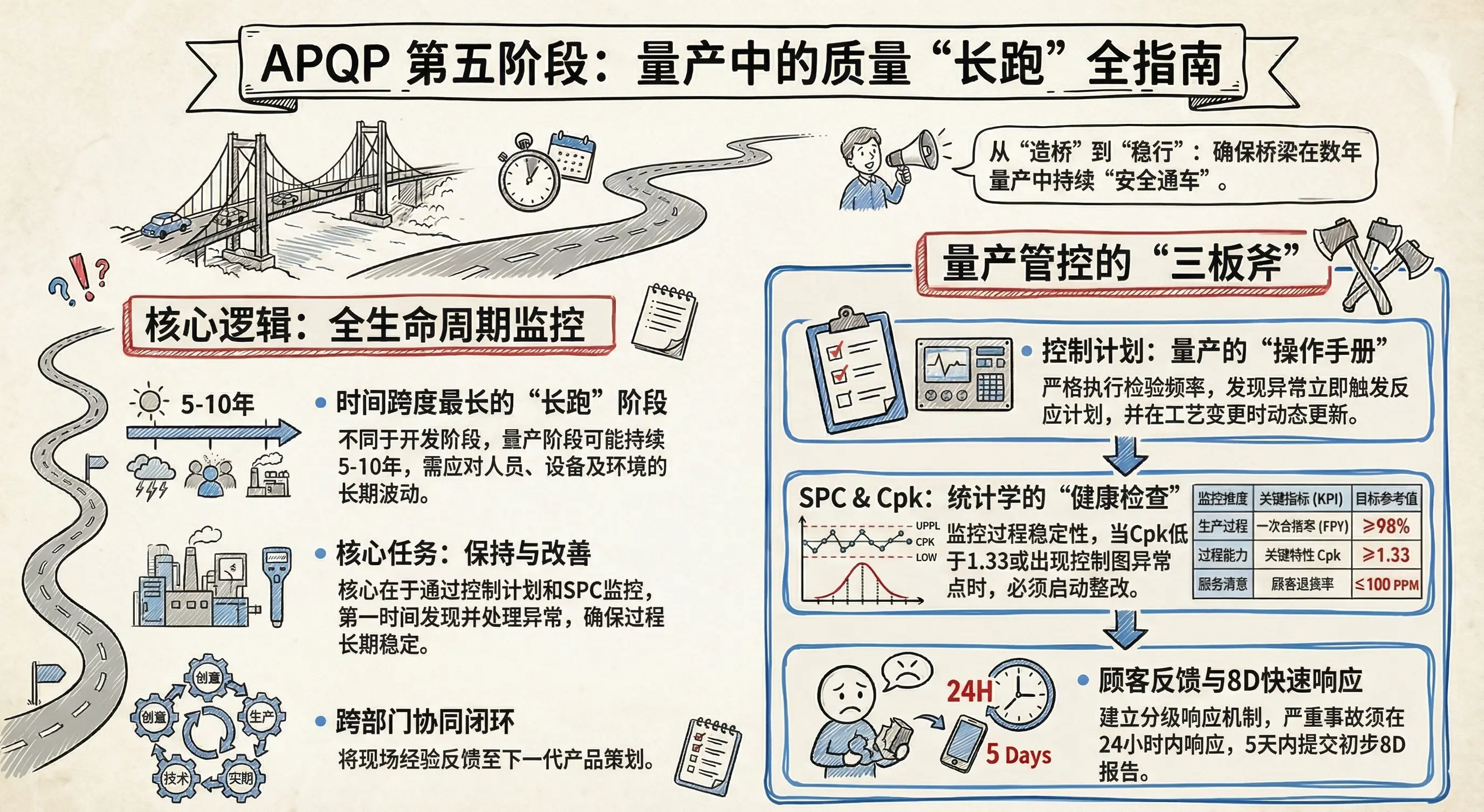 本文系统阐述了APQP(先期产品质量策划)第五阶段——“量产、反馈、评定与纠正” 的本质内涵与实践框架。区别于传统认知中将APQP止步于PPAP批准的误区,文章旗帜鲜明地指出:第五阶段并非收尾,而是APQP生命周期中最长、最复杂、最具战略价值的持续运行阶段,贯穿产品整个市场生命周期(可达5–10年甚至更久)。其核心使命已从“确保首批合格”升维为“保障长期稳定+驱动动态进化”。